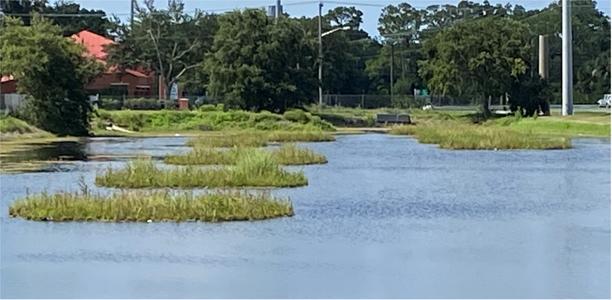 The Broadway Pond is adjacent to U.S.1 near Port St. John, Florida. The drainage basin for this pond is mostly residential and roadway. Although the Indian River Lagoon is located only 400 feet to the east, the pond is located on a low ridge and has fresh water. It covers 2.75 acres (119,790 square feet), and has 5,990 square feet of floating wetlands, composed of 12 islands. The nutrient loads to the Broadway ponds are not as heavy as some of the stormwater ponds in east Brevard County. The nutrient harvests over the past six years have prevented 966.5 pounds of nitrogen and 83.1 pounds of phosphorus from reaching the Indian River Lagoon estuary.