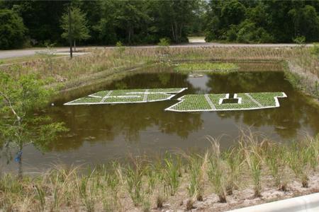 The Stetson University Aquatic Sports Center is located on the shoreline of Lake Beresford, part of the St. Johns River. The Stetson Biology Department designed a system to minimize impacts to the lake and river with several innovative stormwater capture and treatment features. A pond collects all of the runoff from the pervious parking areas and includes three Beemats floating treatment wetlands. One is circular and includes several native flowering species. The other two are fabricated in the shape of the Stetson logo and are planted with grasses.